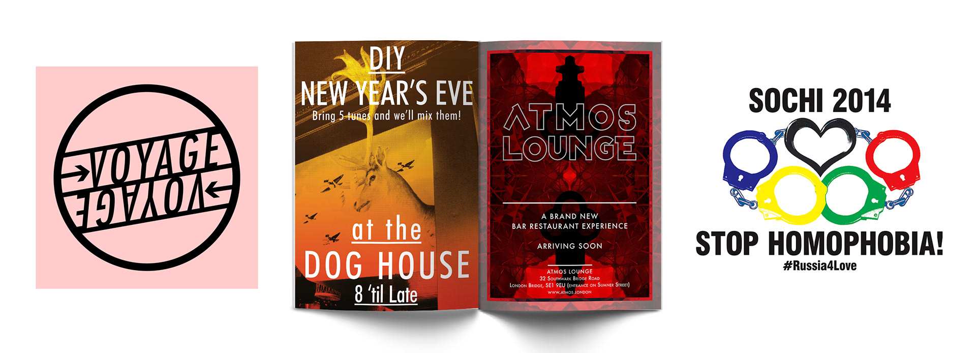 'Voyage Voyage' logo 'Royal Vauxhall Tavern /Flyer 'Dog House' in Kennington / Magazine advert 'Atmos Lounge' Southwark / Logo against Russia's anti-gay laws